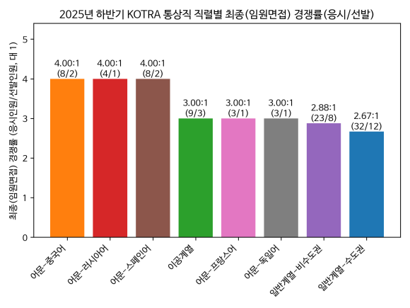 중국어: 채용인원 2명, 지원자수 50명 → 25.0 대 1